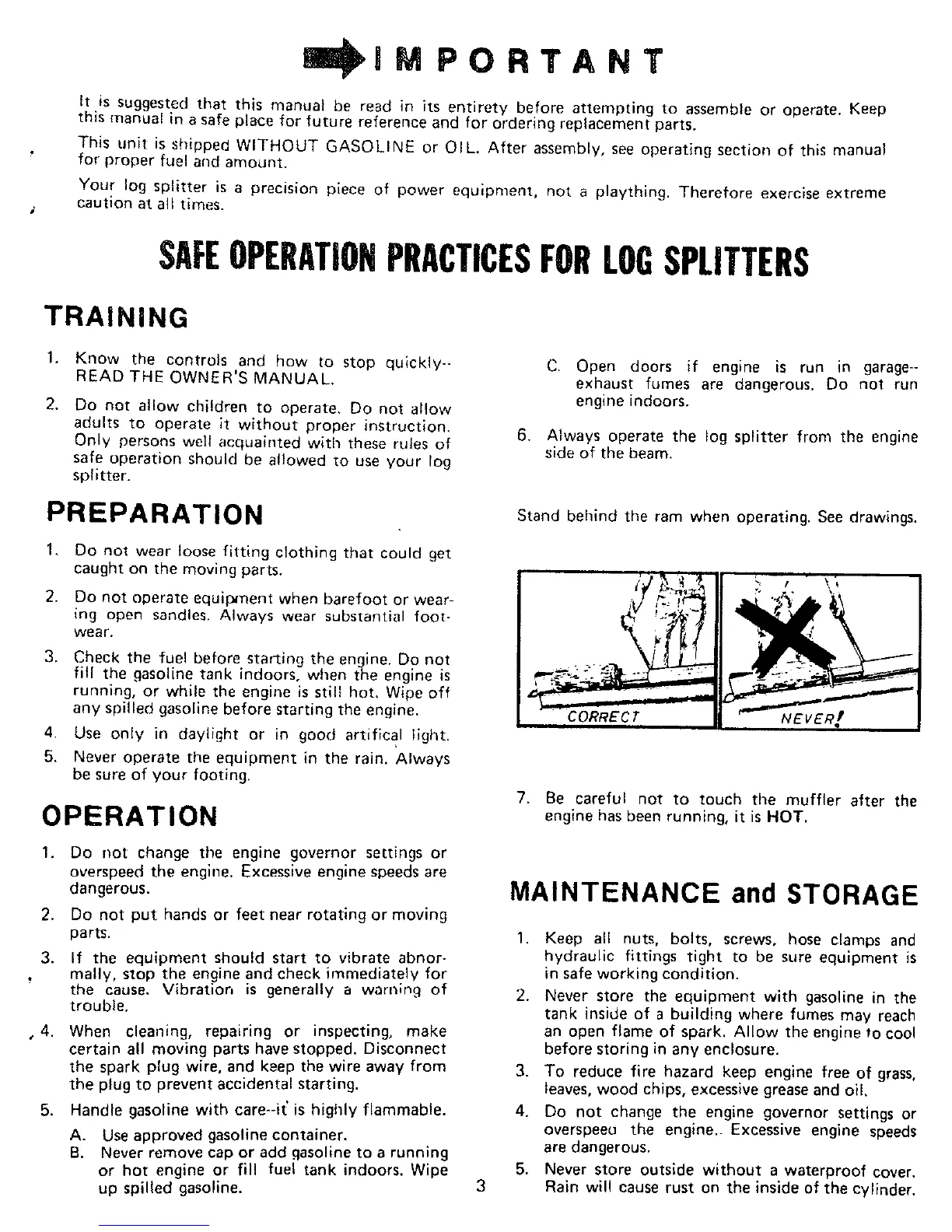 Yard-Man 24645-9 - Safe Operation Practices for Log Splitters; Training; Preparation; Operation