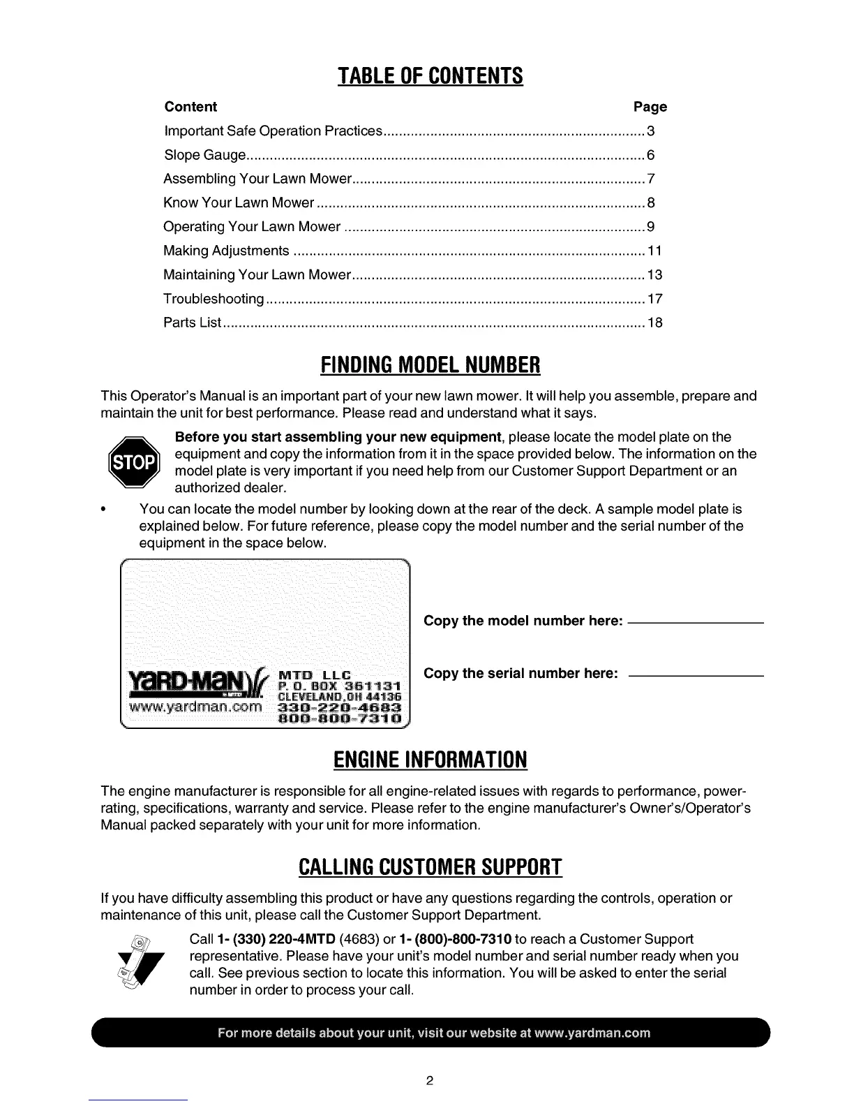 Call 1- (330) 220-4MTD (4683) or 1- (800)-800-7310 to reach a Customer Support