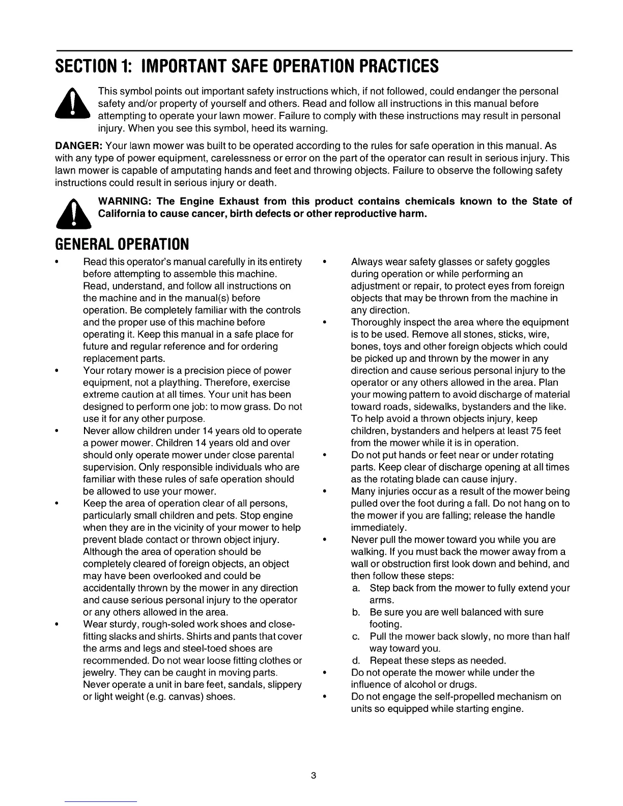 DANGER: Your lawn mower was built to be operated according to the rules for safe operation in this manual. As