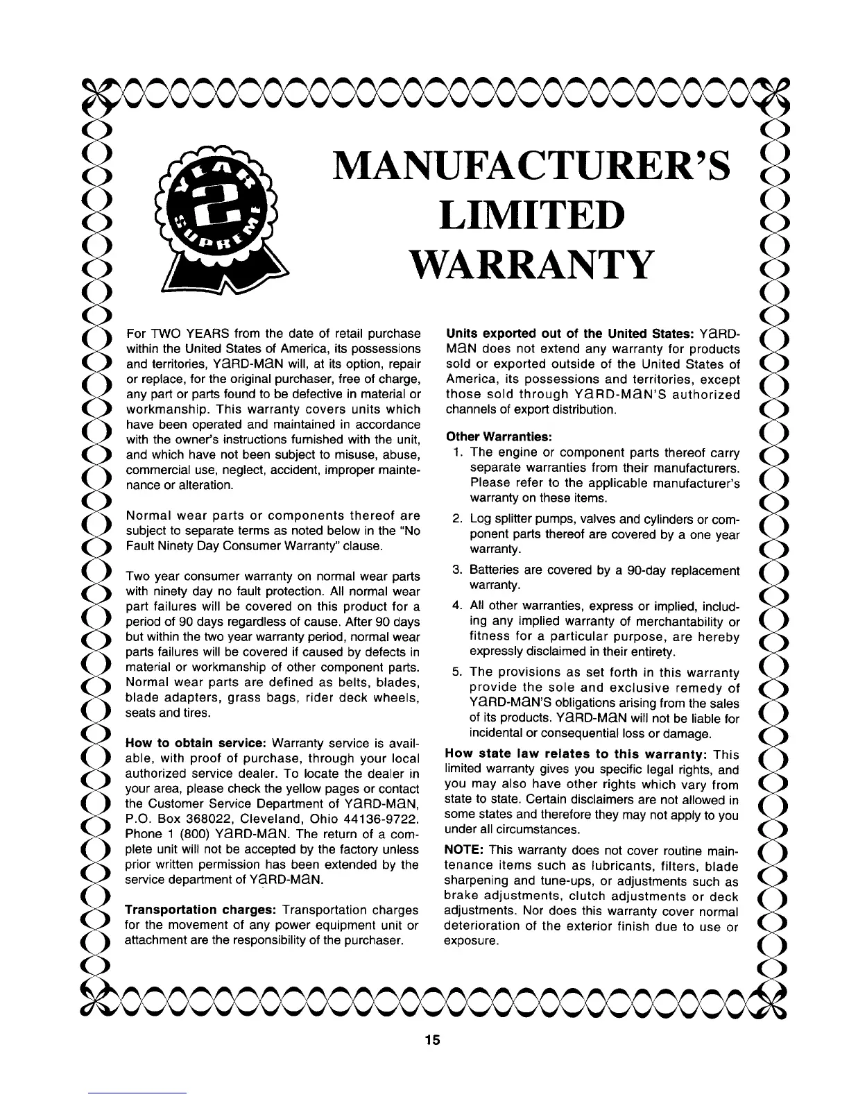 Yard-Man 447 - MANUFACTURERS LIMITED WARRANTY