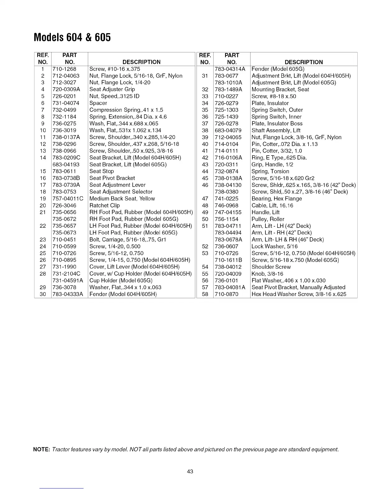 NOTE: Tractor features vary by model. NOT all parts listed above and pictured on the previous page are standard equipment.