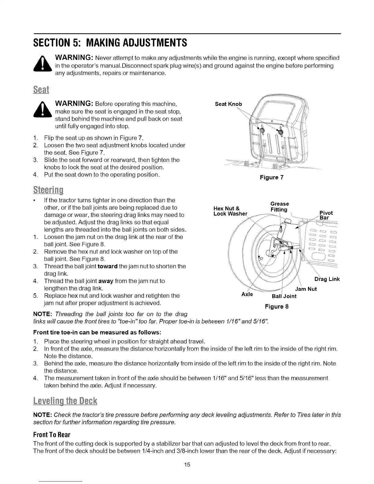 NOTE: Check the tractor's tire pressure before performing any deck leveling adjustments. Refer to Tires later in this
