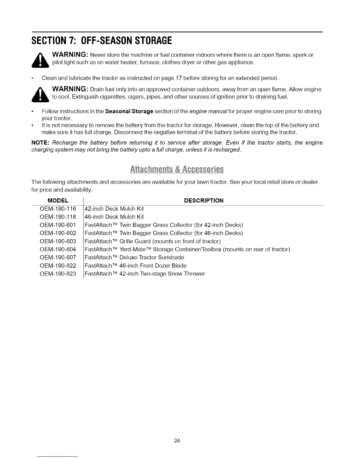 • Follow instructions in the Seasonal Storage section of the engine manual for proper engine care prior to storing