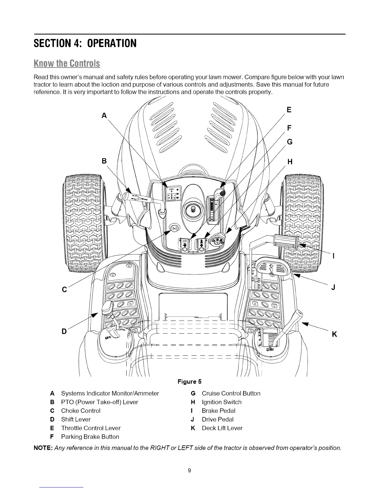 NOTE: Any reference in this manual to the RIGHT or LEFT side of the tractor is observed from operator's position.