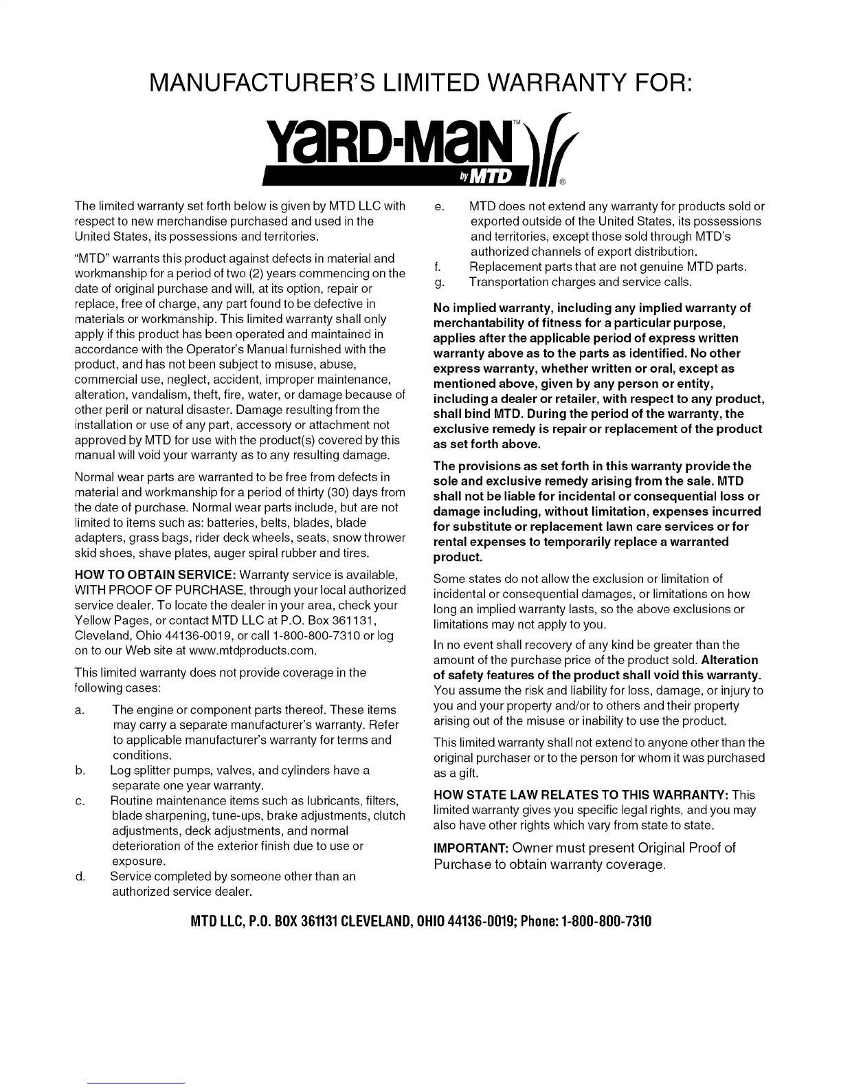 MTD LLC, P.O.BOX361131CLEVELAND,OHIO44136-0019; Phone:1-800-800-7310