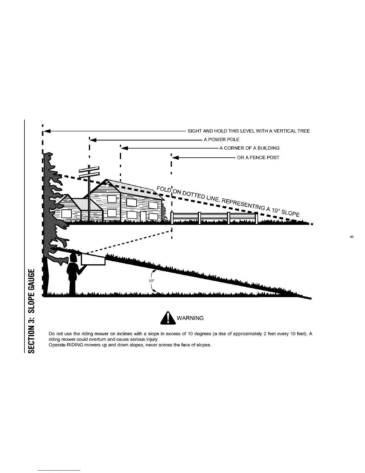 Do not use the riding mower on inclines with a slope in excess of 10 degrees (a rise of approximately 2 feet every 10 feet). A