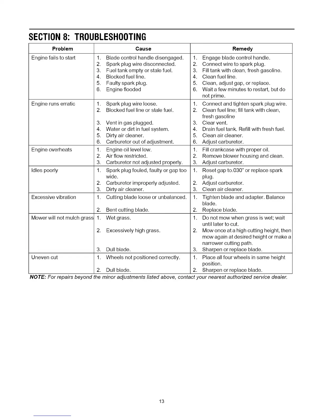 NOTE: For repairs beyond the minor adjustments listed above, contact your nearest authorized service dealer.