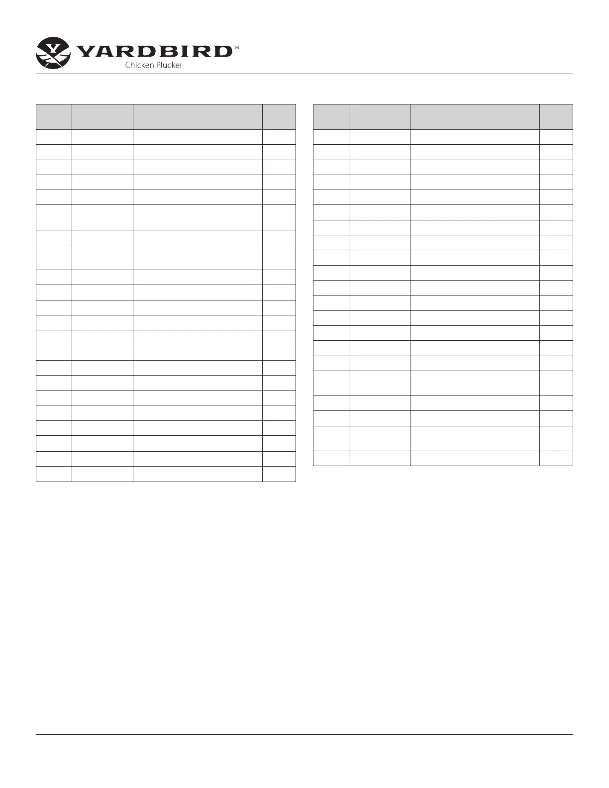 Check for parts online at www.yardbirdpluckers.com or call 800-345-6007 M-F 8-5