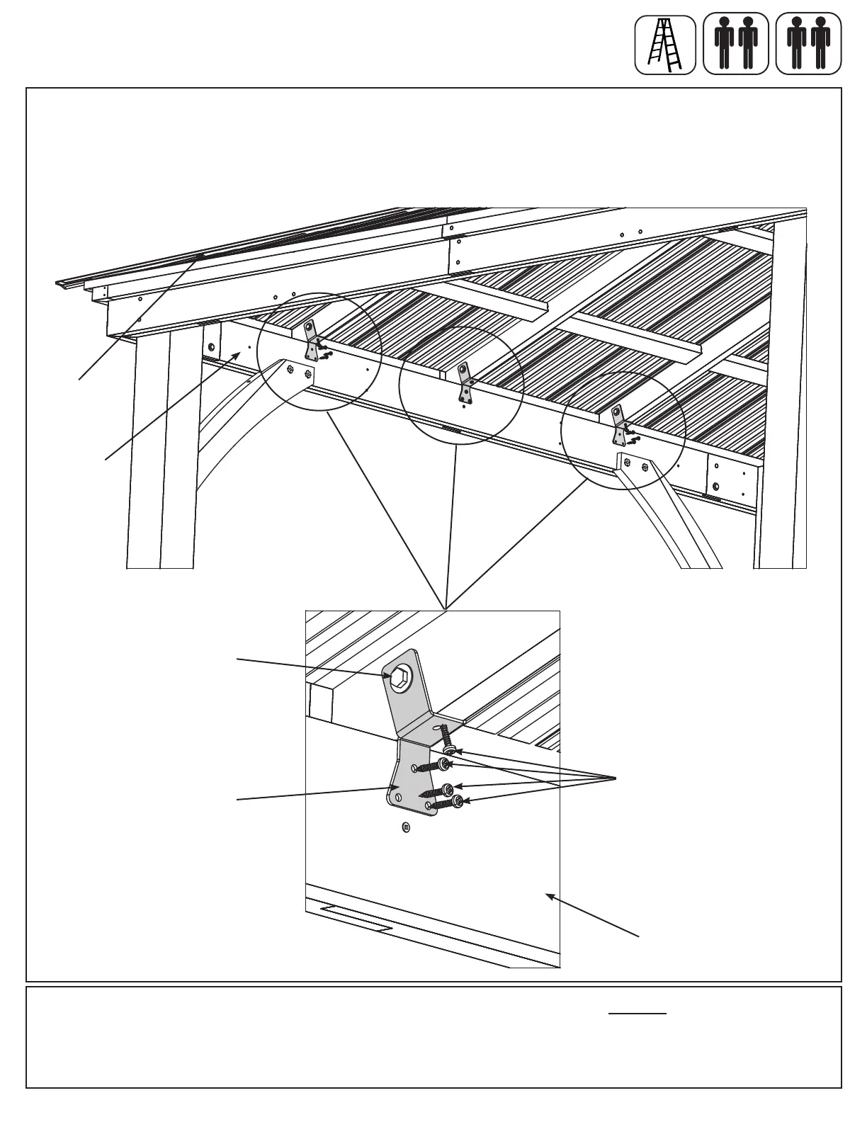 A: From inside the assembly attach Rafter Beam Brackets to Beam Assemblies and rafters with four #10 x 1-1/4”