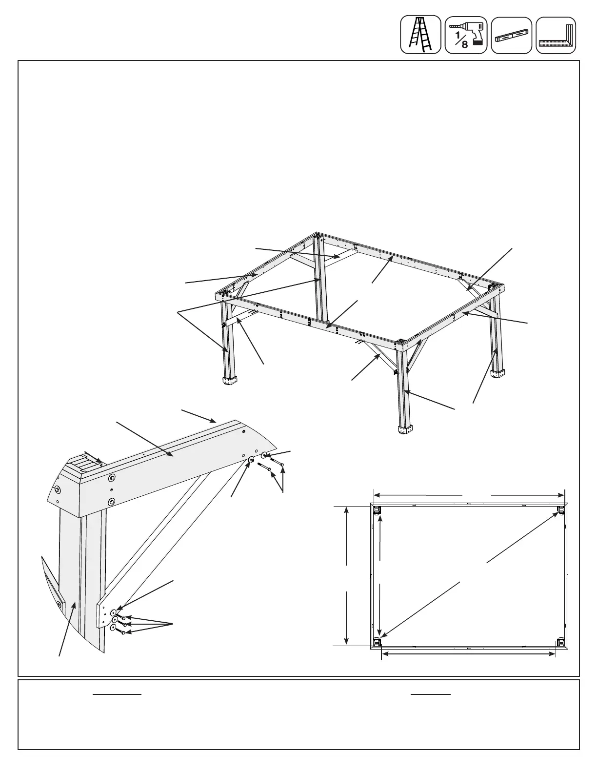 H: Make sure the Frame Assembly is square and level then facing one Long Beam Assembly from the outside