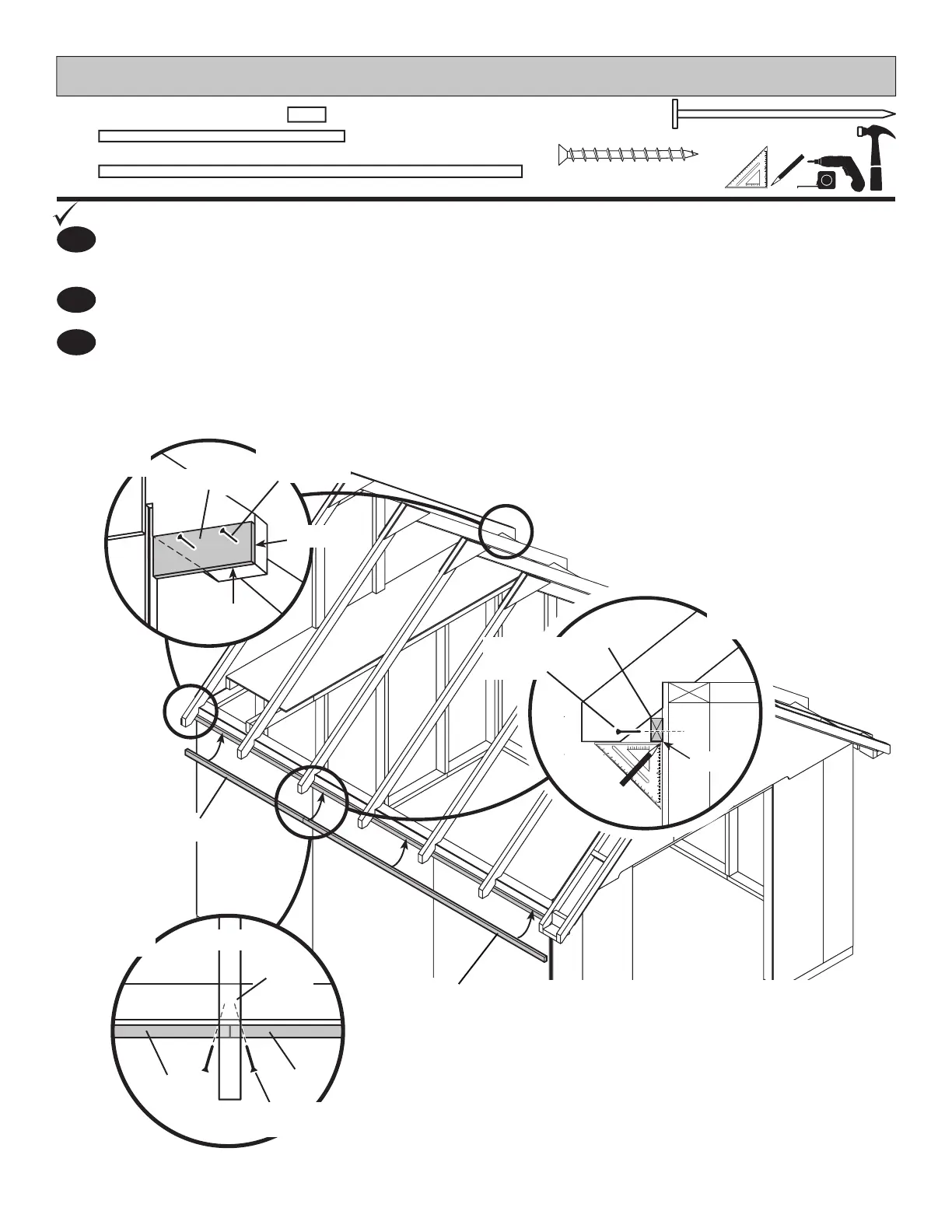 At the back of the shed, install (2) sof t llers ush to bottom and outside edges of rafter .