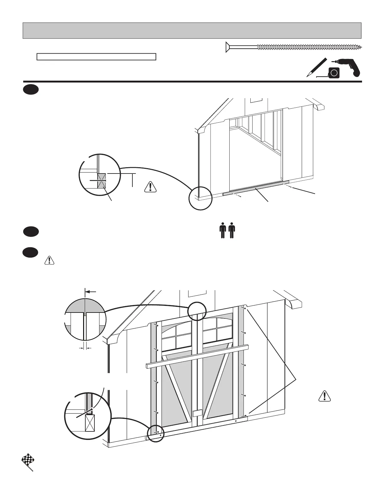 Screw hinge boards into wall supports and oor with (10) 3" screws, as shown.