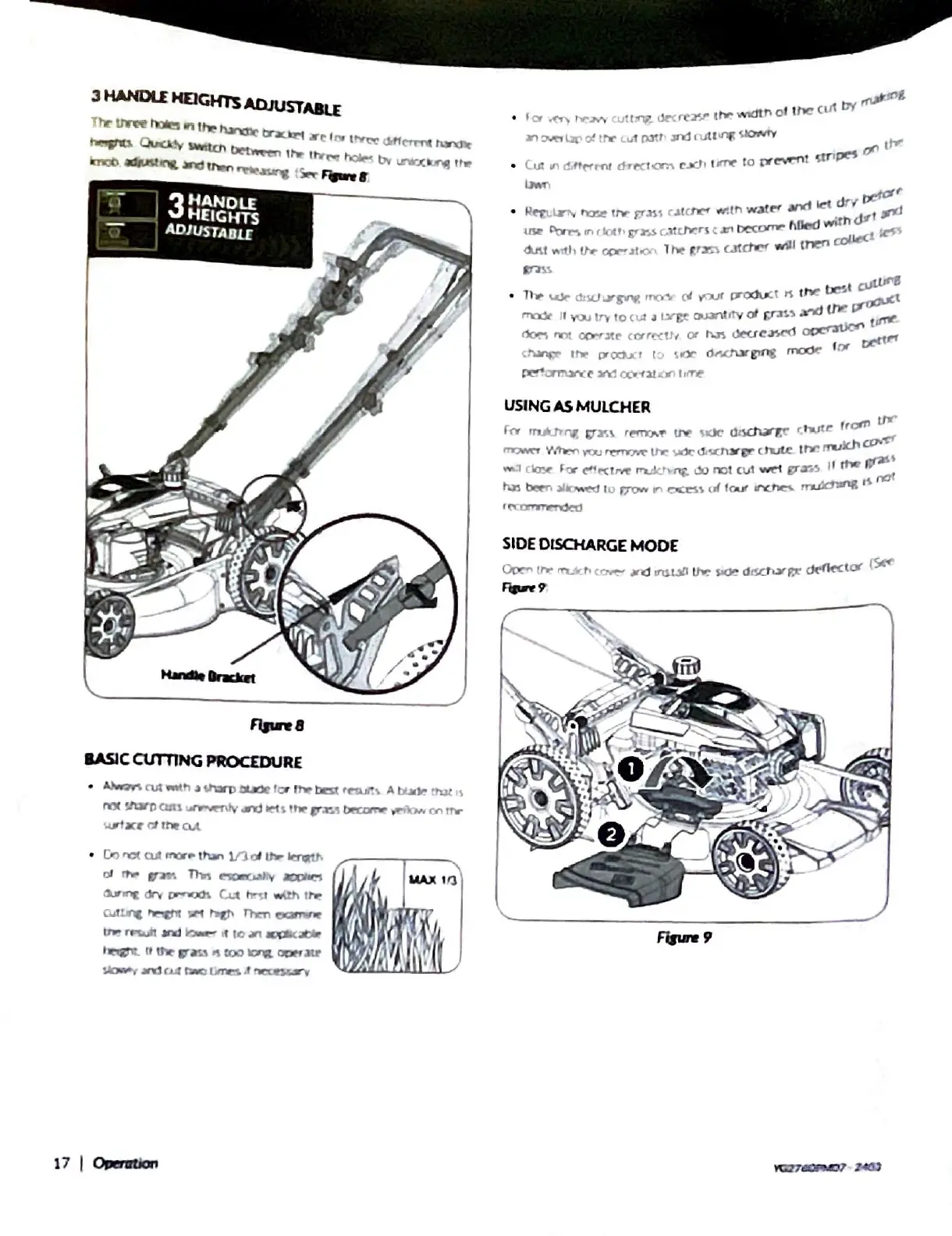 YARDMAX YG2760 - Handle Heights Adjustable; Basic Cutting Procedure; Using as Mulcher; Side Discharge Mode