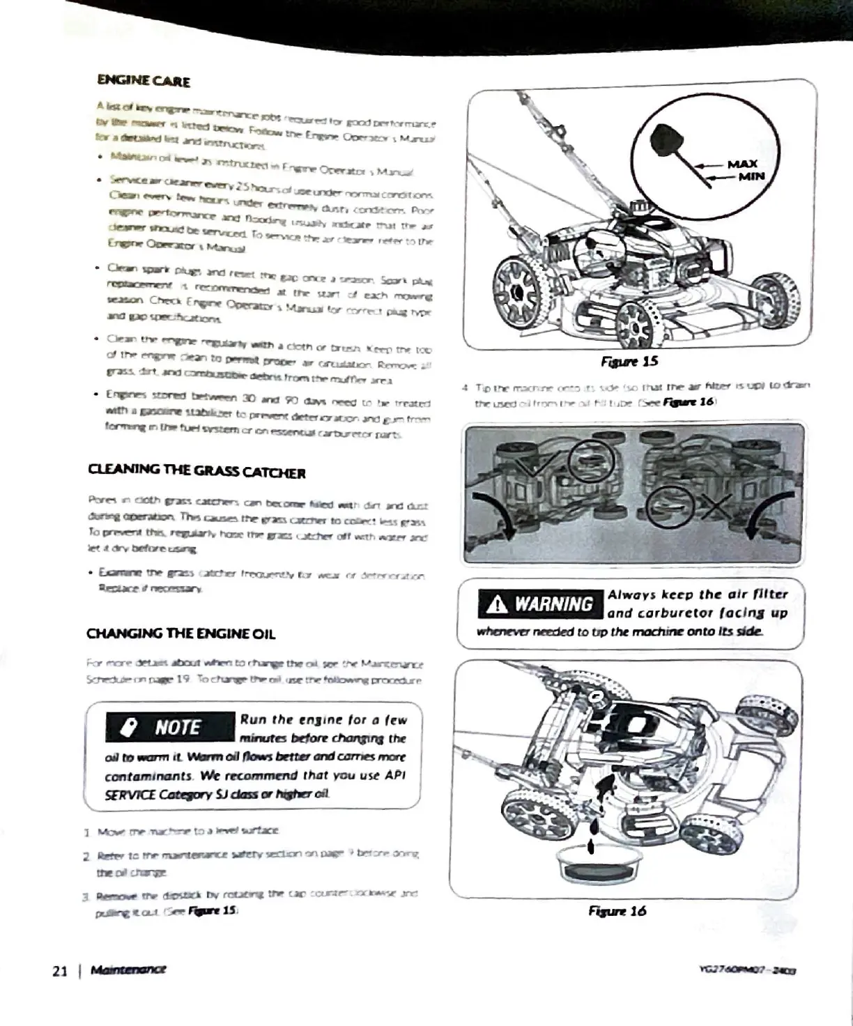 YARDMAX YG2760 - Engine Care; Cleaning the Grass Catcher; Changing the Engine Oil