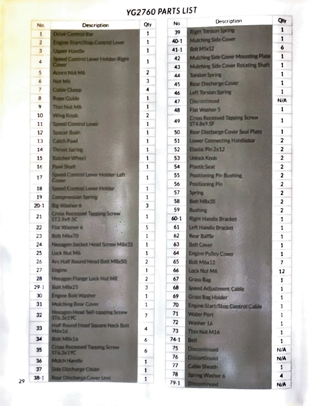 YARDMAX YG2760 - Parts List