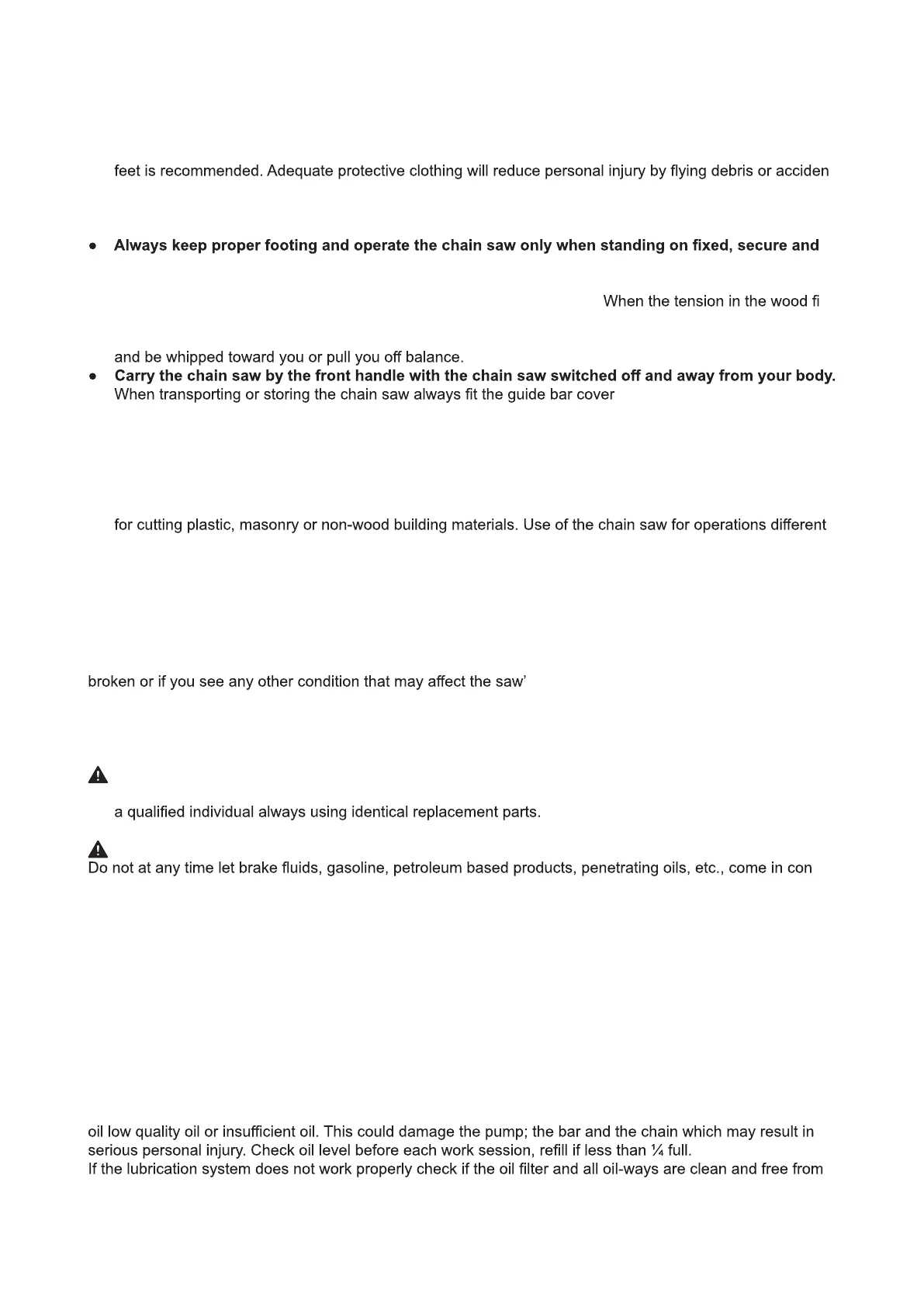 ● Do not operate a chain saw in a tree. Operation of a chain saw while up in a tree may result in person-