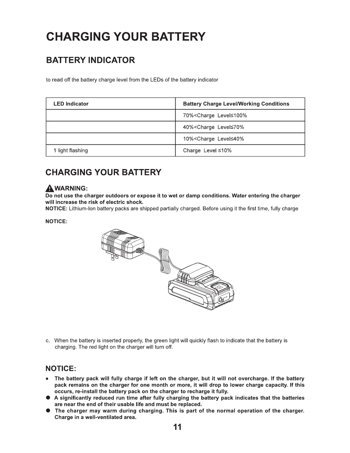 a. Connect the charger to the power supply (120V~60Hz). The green charging indication LED will turn on
