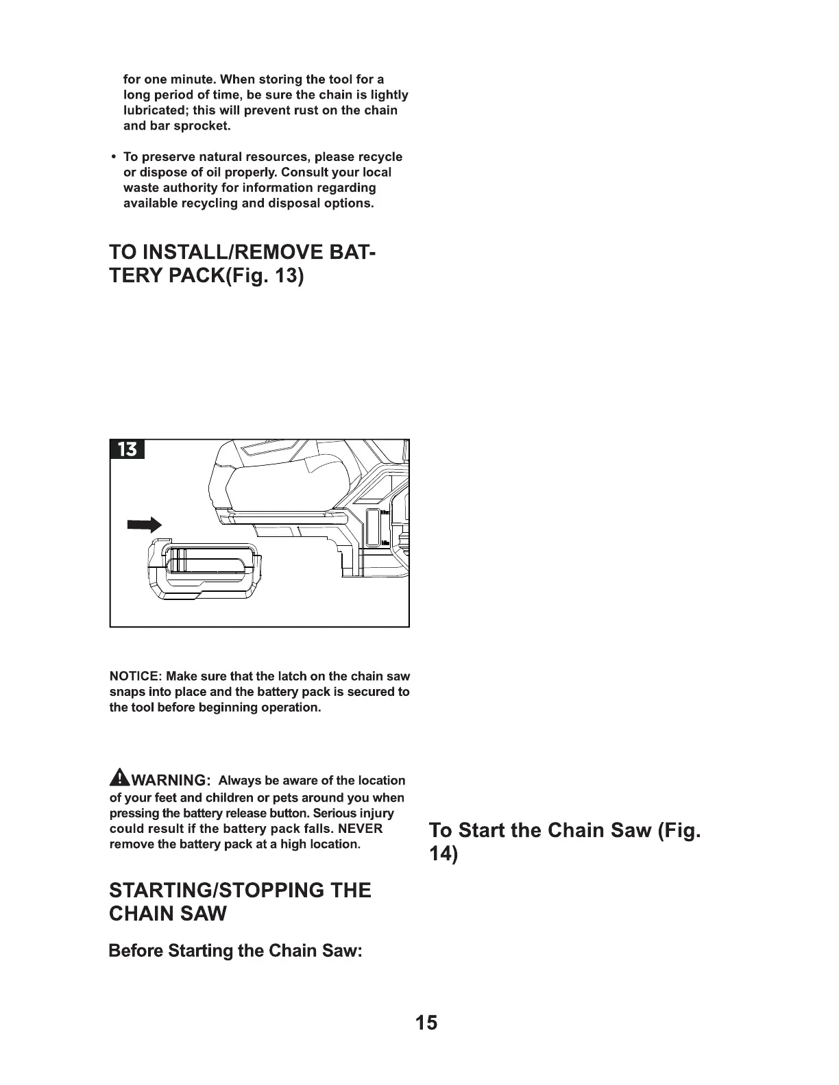 b. Press the battery pack towards the chainsaw