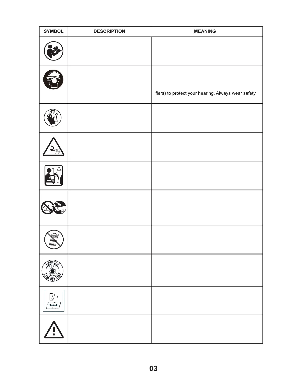Always hearing protection (ear plugs or ear muf -