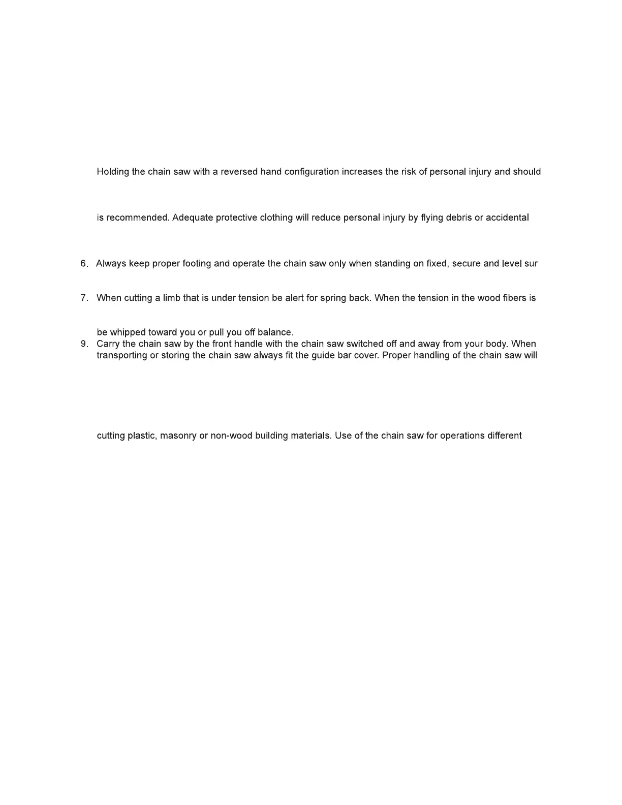 5. Do not operate a chain saw in a tree. Operation of a chain saw while up in a tree may result in personal