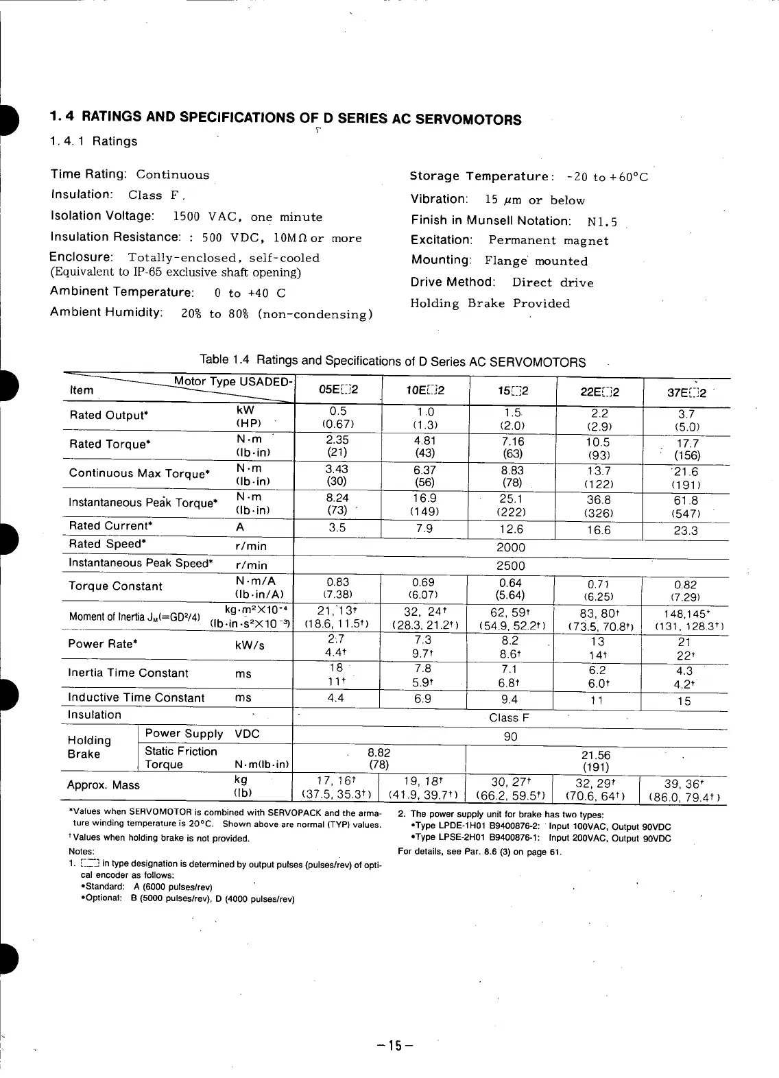 Table 1.4 Ratings and Specifications of D Series AC SERVOMOTORS