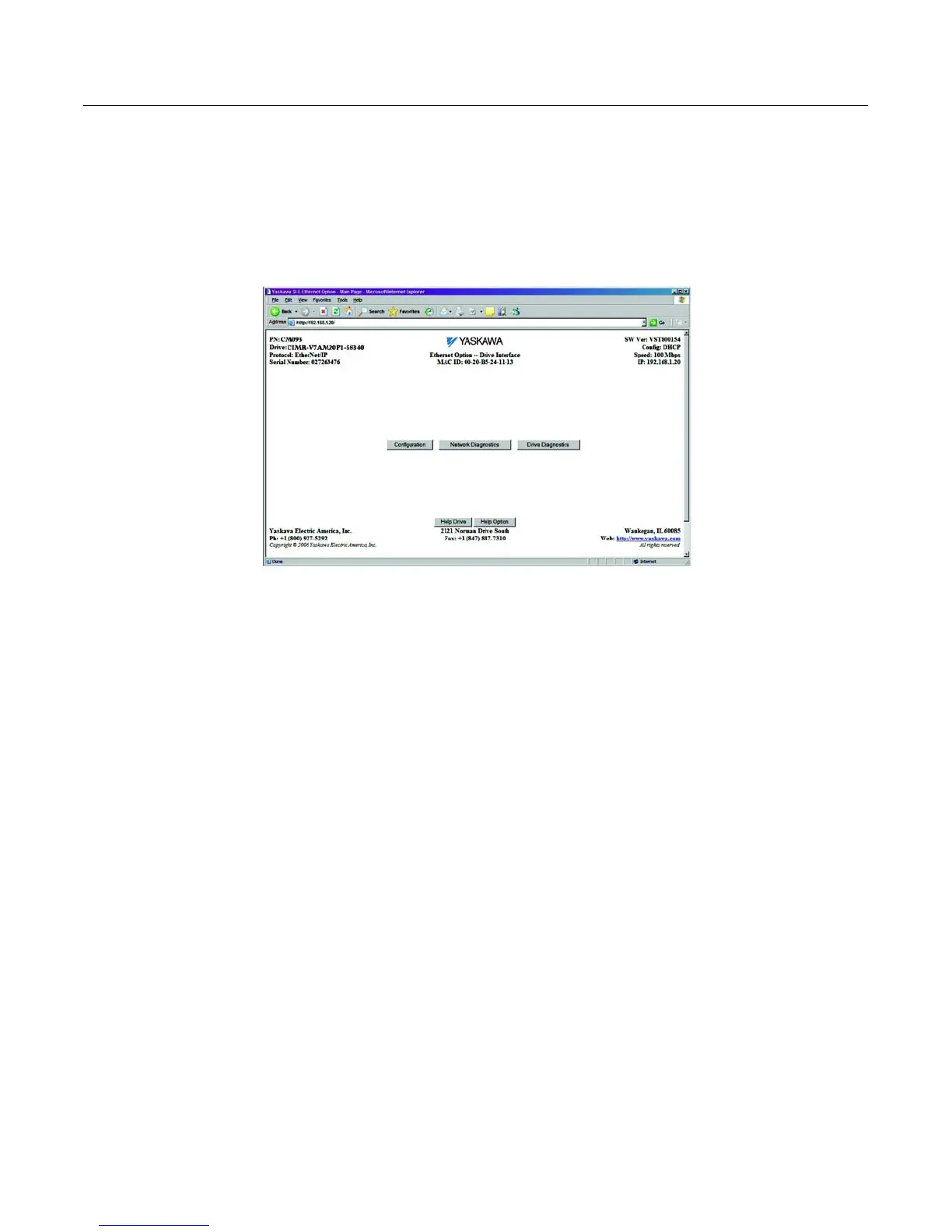 The browser interface to the EtherNet/IP Option Kit can be used for configuring the card or for network and drive information and