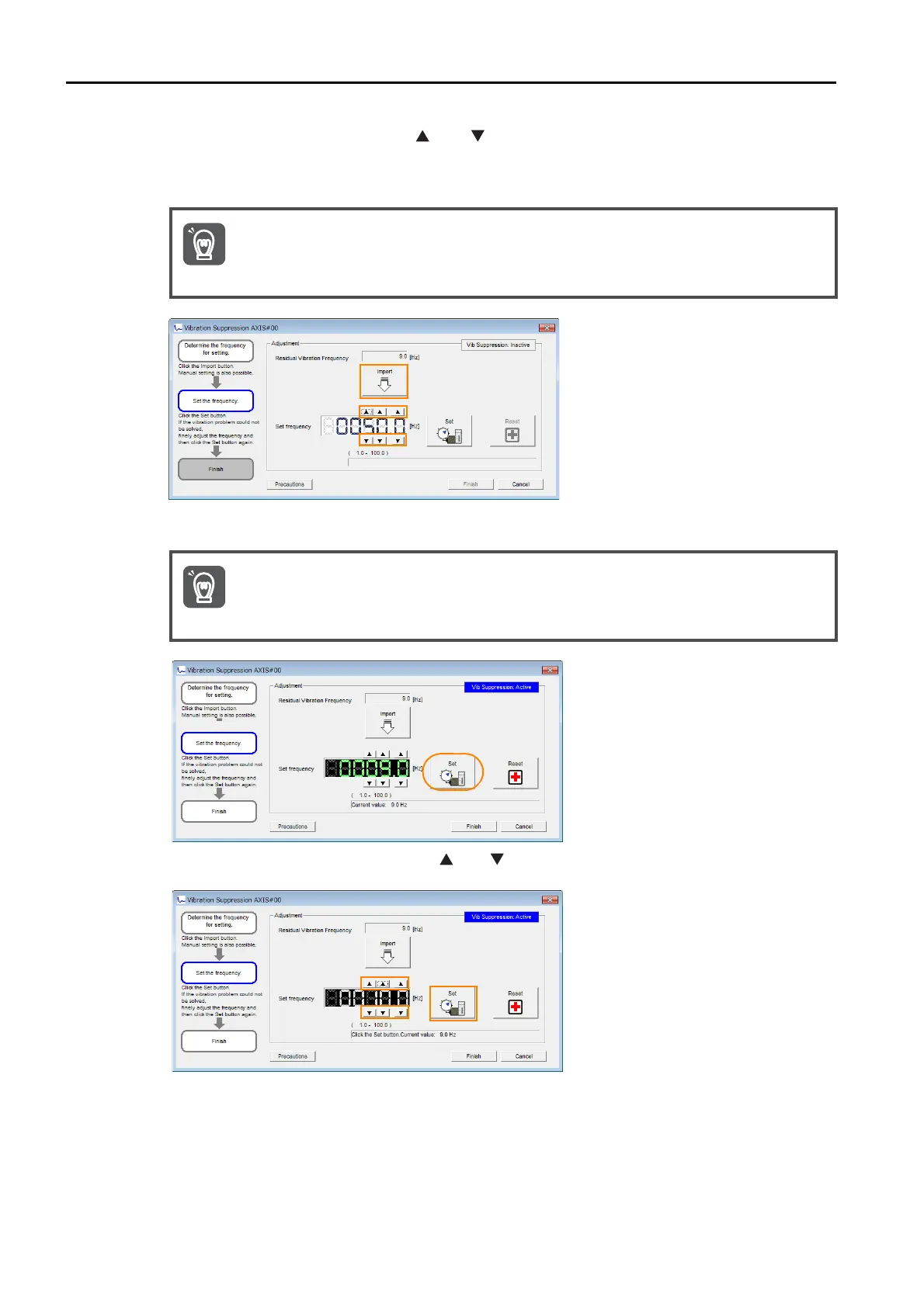 If the vibration is not eliminated, use the and Buttons for the set frequency to fine-tune the