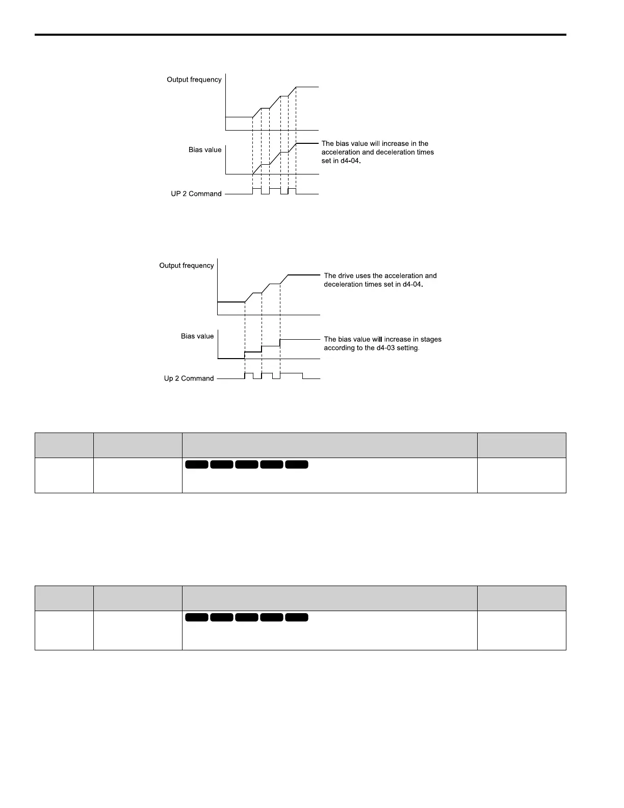 When the Up/Down 2 Command [H1-xx = 75, 76] is active, the drive increases or decreases the bias in steps for the