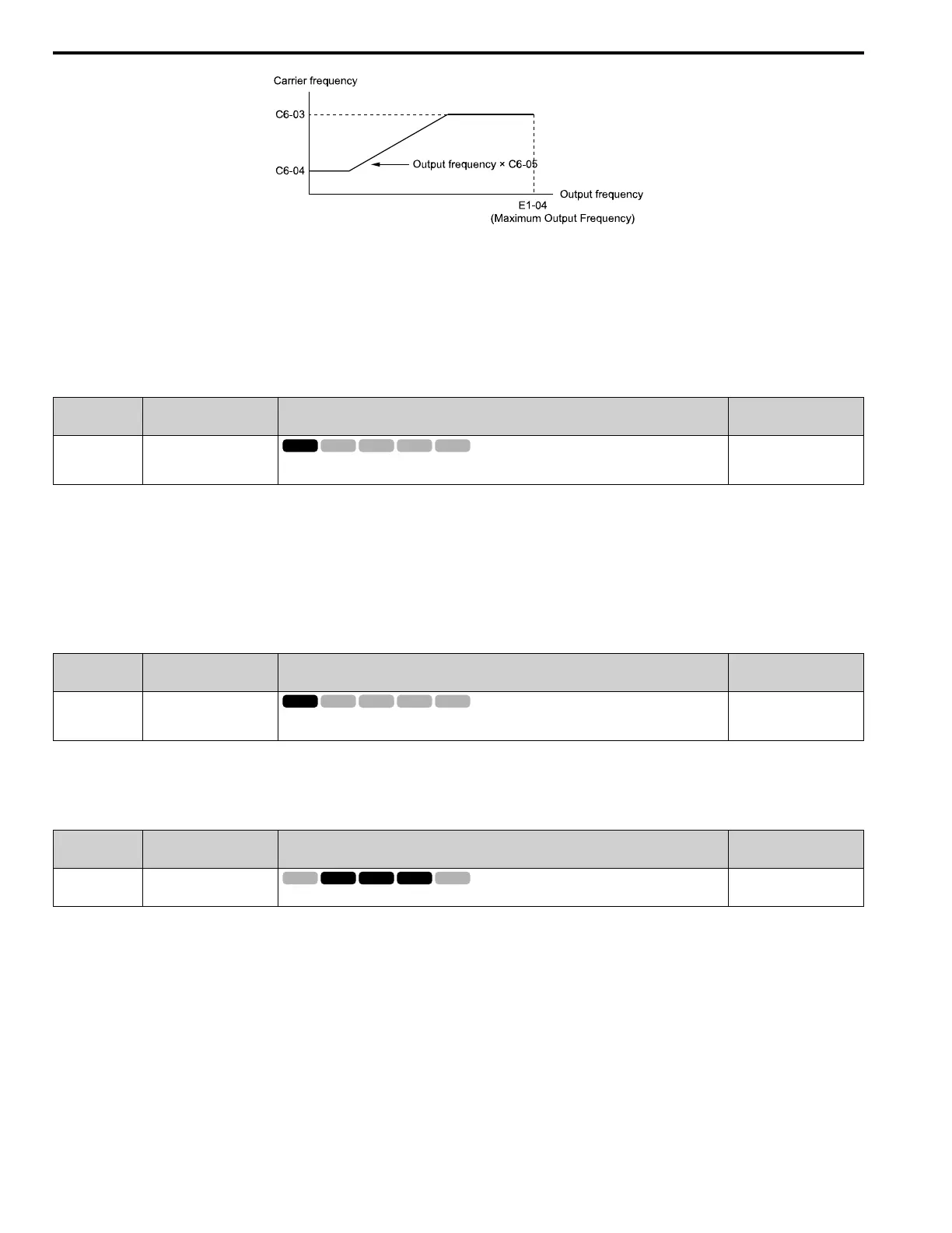 • When C6-05 ≤ 7, the drive disables C6-04. The carrier frequency is fixed to the value set to C6-03.