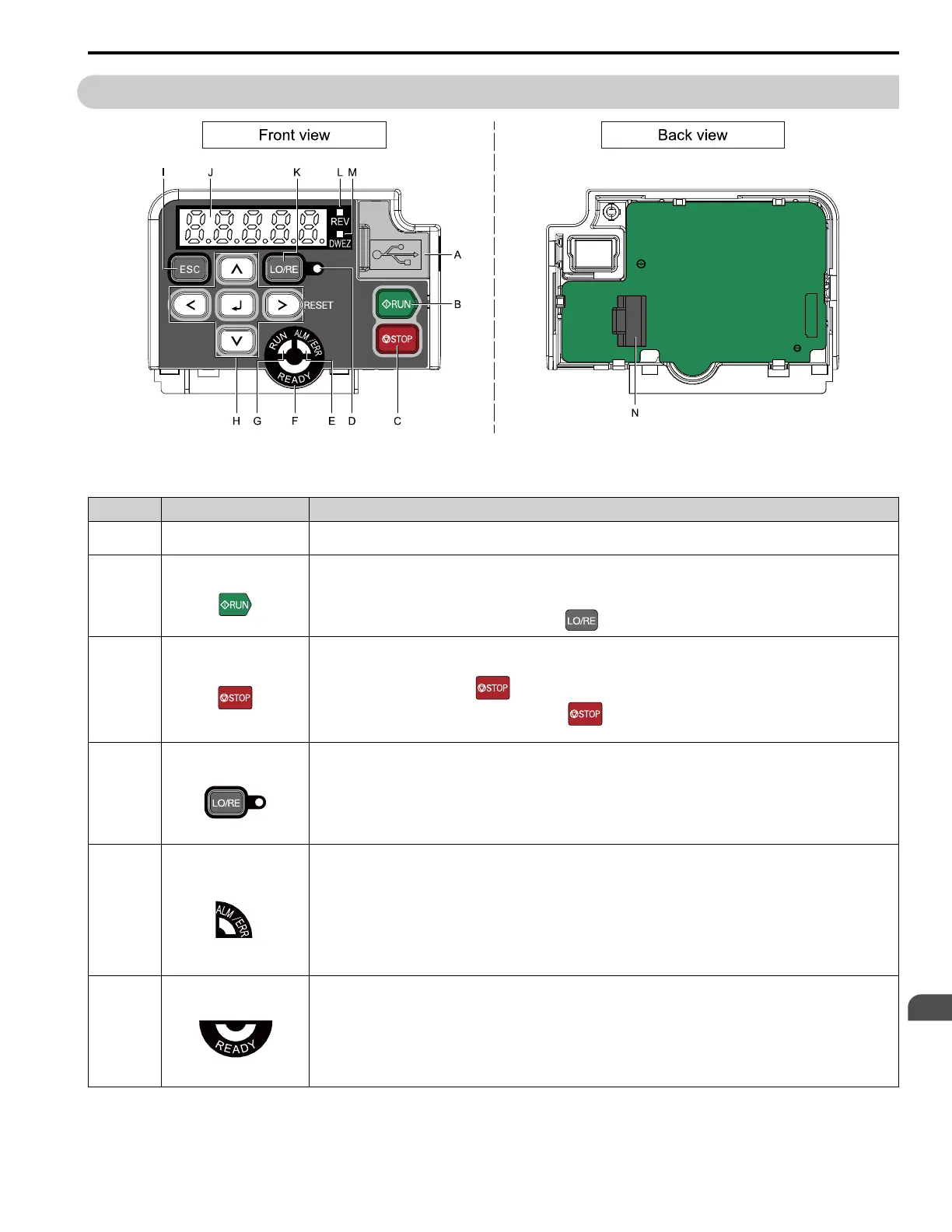 Uses a stop-priority circuit. Push to stop the motor. This will also apply when a Run command (REMOTE Mode) is