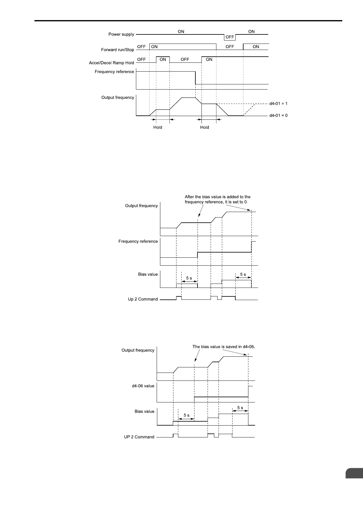 save the bias value in d4-06 [Frequency Ref Bias (Up/Down 2)]. The drive saves the frequency reference + d4-