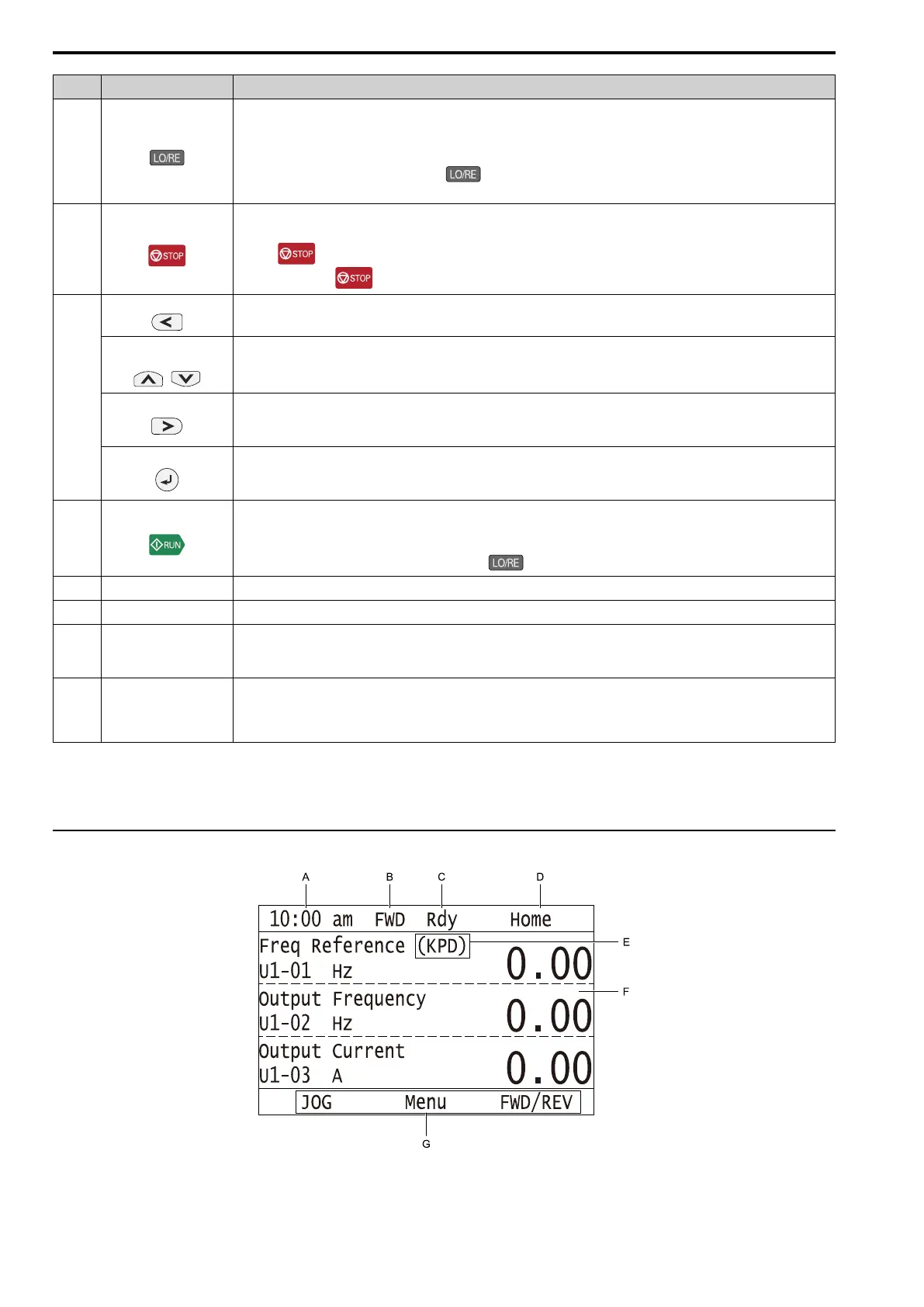 Push to stop the motor. This will also apply when a Run command (REMOTE Mode) is active at an external Run command