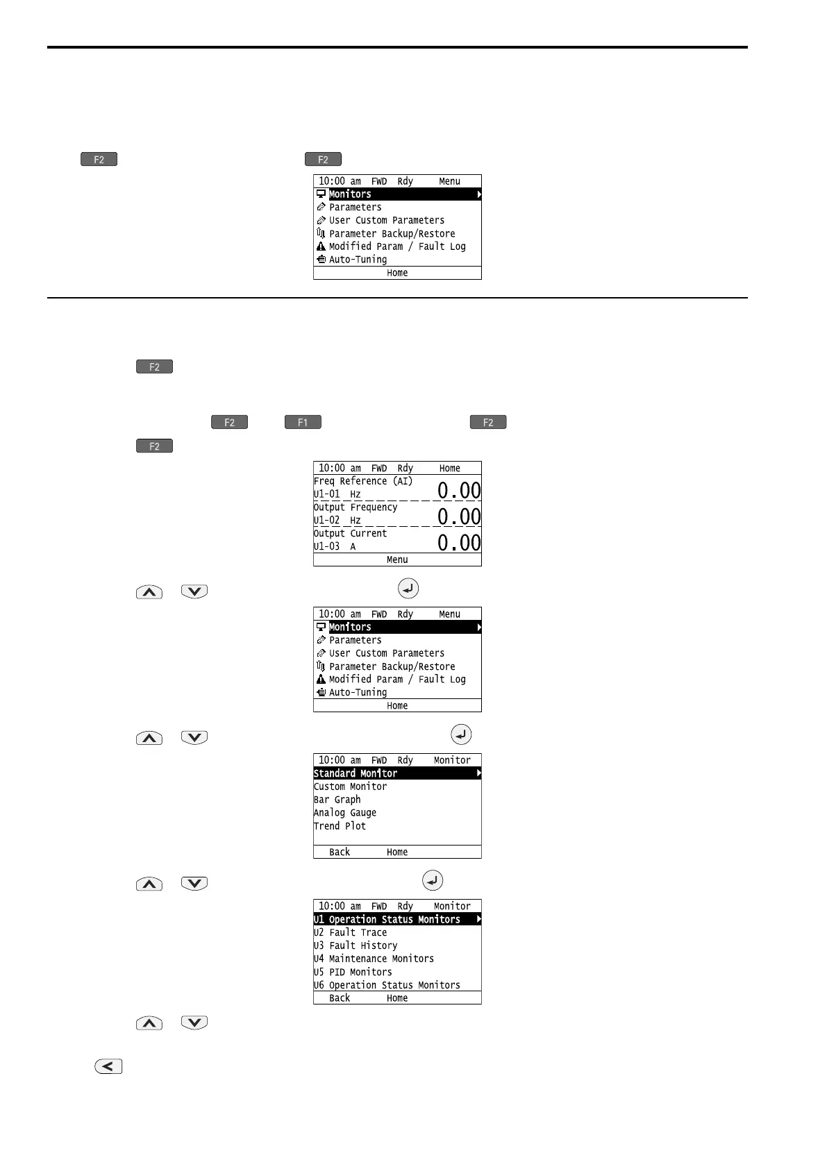 The HOME screen must show U1-01 [Frequency Reference] or you must set the keypad as the Run command source (REMOTE) to use