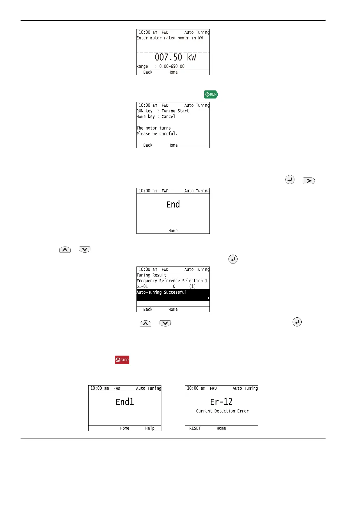 If the drive detects an error or you push before Auto-Tuning is complete, Auto-Tuning will stop and the keypad will show an