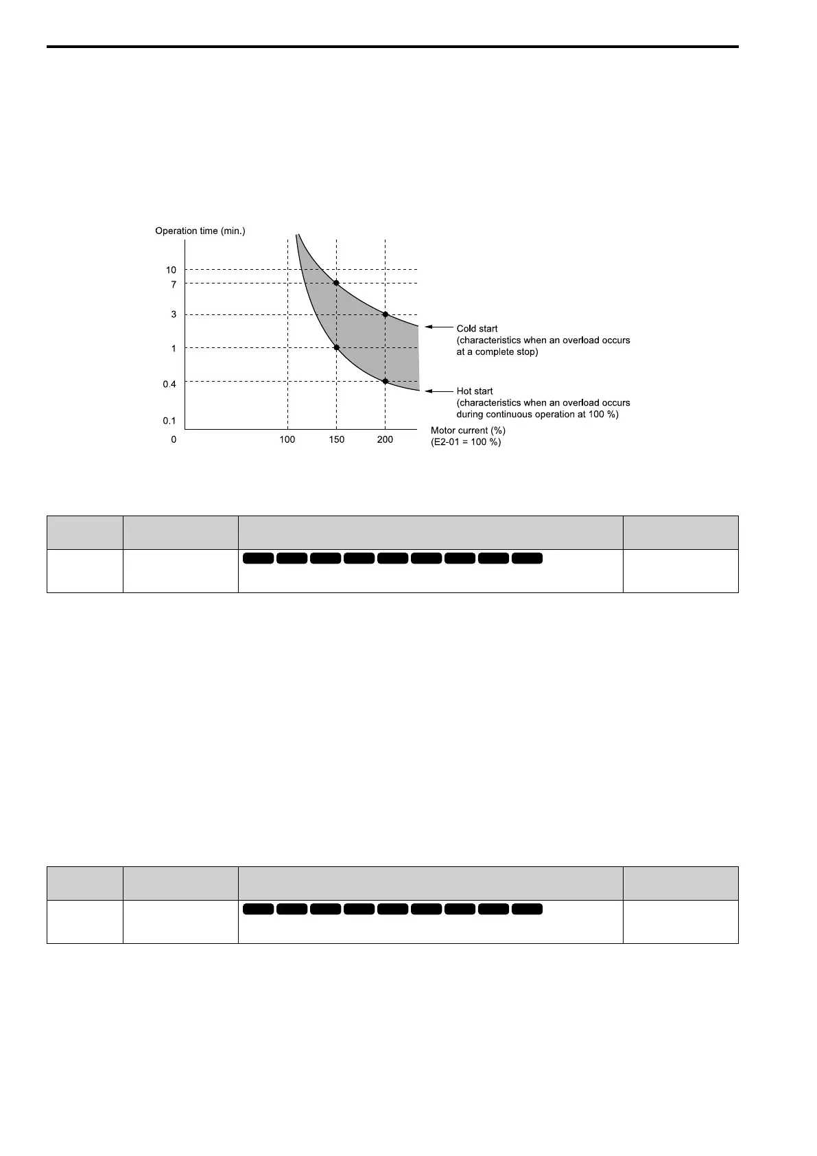Shows the motor protection operation time characteristics when overload occurs from continuous operation