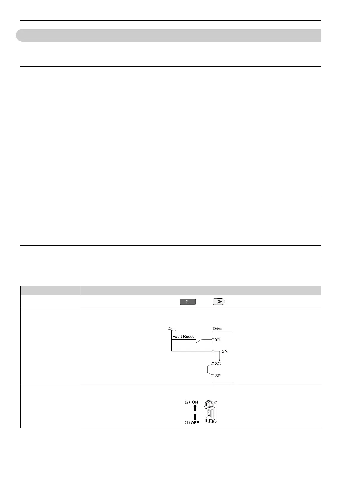 Switch ON the MFDI terminal set to H1-xx = 14 [MFDI Function Select = Fault Reset].