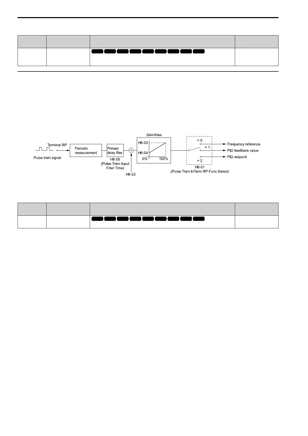 Selection 2 = Pulse Train Input], the drive inputs the frequency reference received from terminal RP.