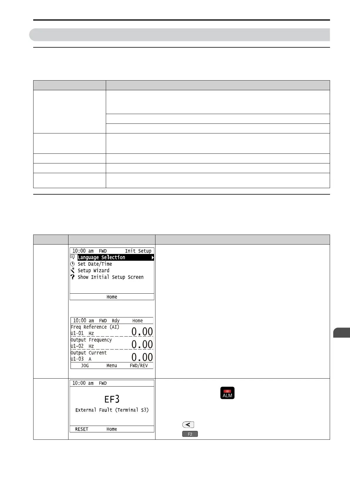 Check the items in Table 3.5 after energizing the drive. The keypad will show these screens depending on the
