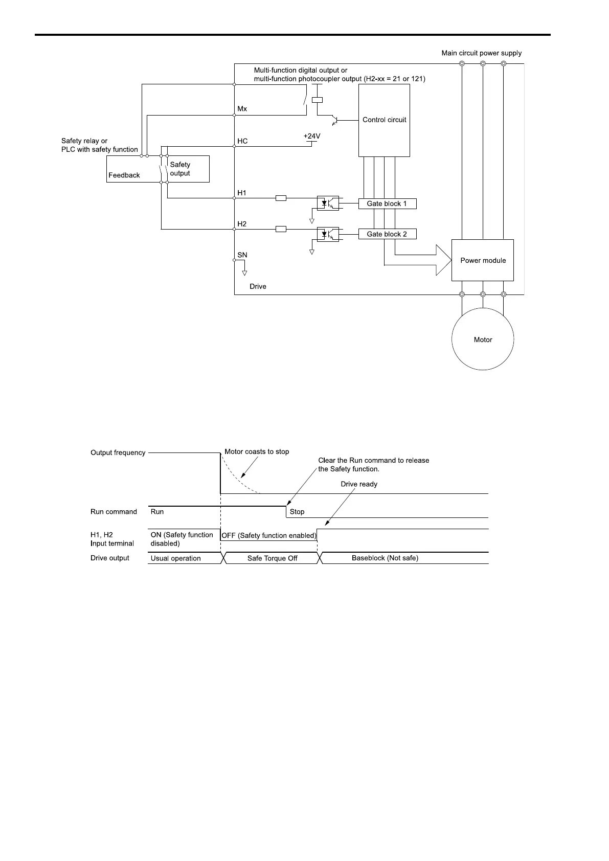 NOTICE: A maximum of 3 ms will elapse from when terminals H1 or H2 shut off until the drive switches to the "Safe Torque Off"