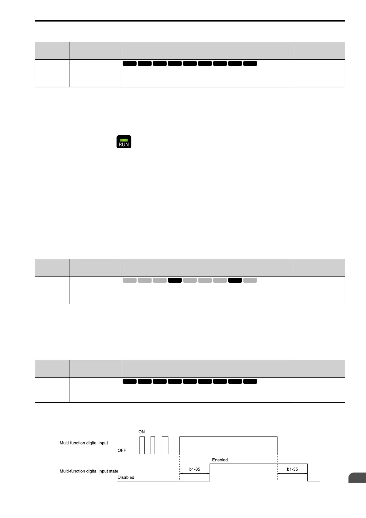When the on/off time for MFDIs is longer than the time set in b1-35, the drive activates the MFDI. Set this