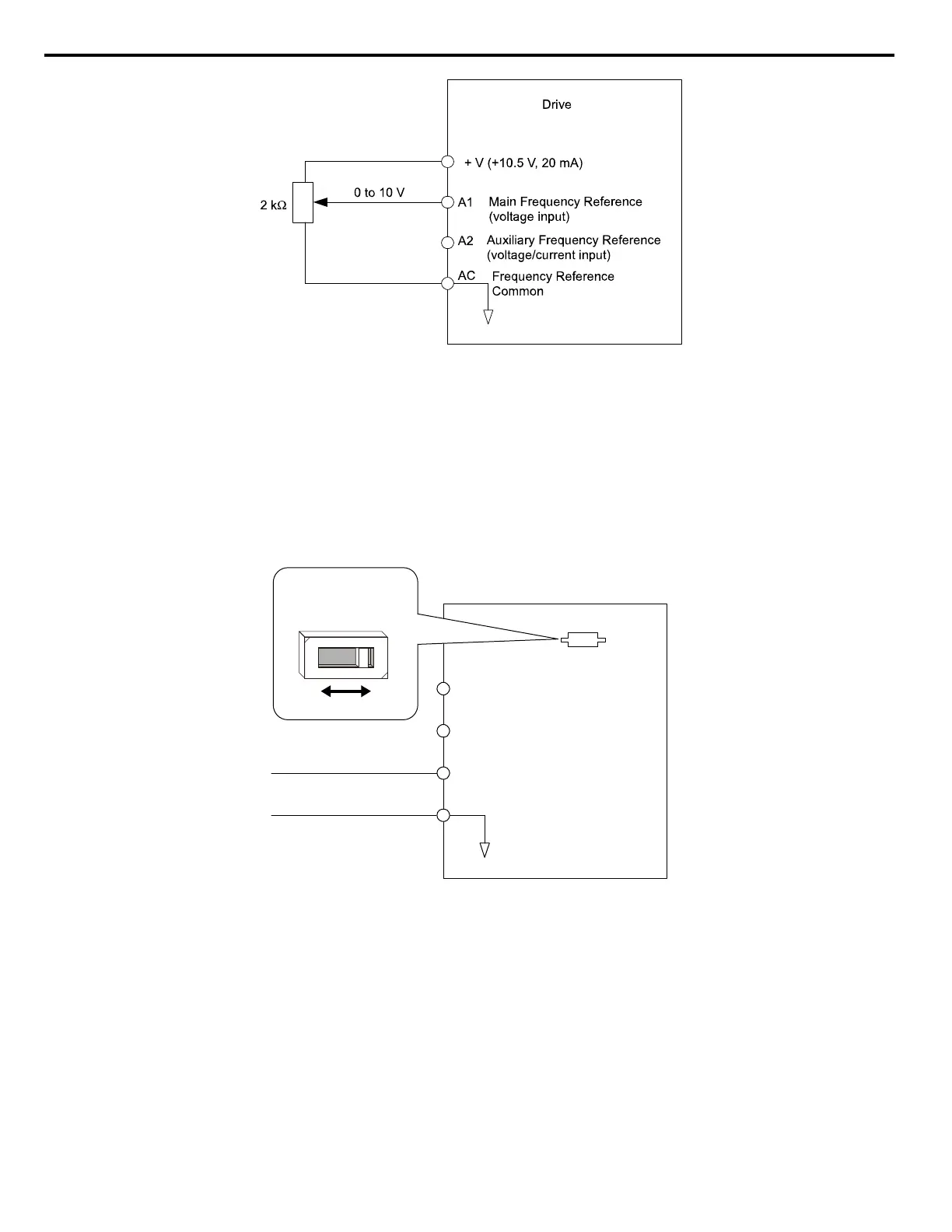 The frequency reference input can be switched between terminal A1 (main) and terminal A2 (auxiliary). When using this