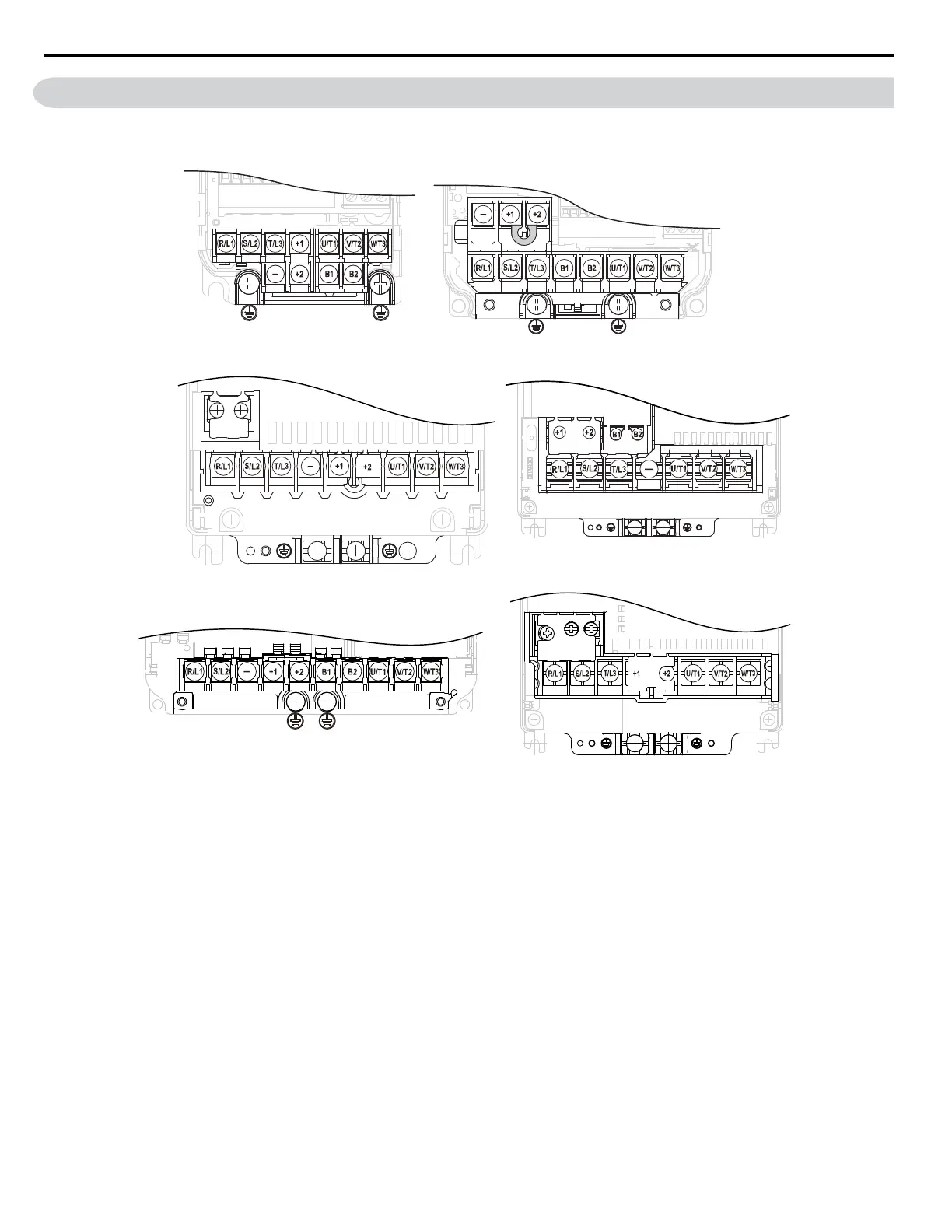 Figure 3.5 provides illustrations of the main circuit terminal block configurations of the different drive sizes.