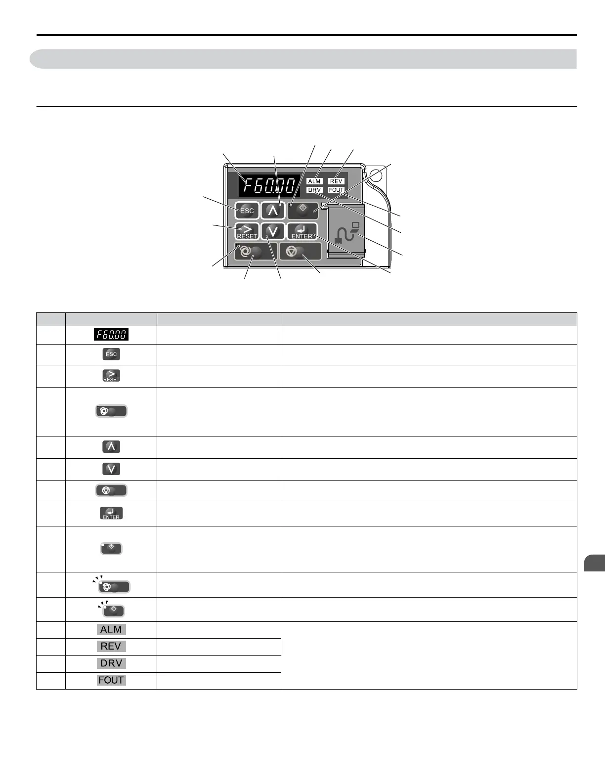 Use the LED operator to enter run and stop commands, display data, edit parameters, as well as display fault and alarm