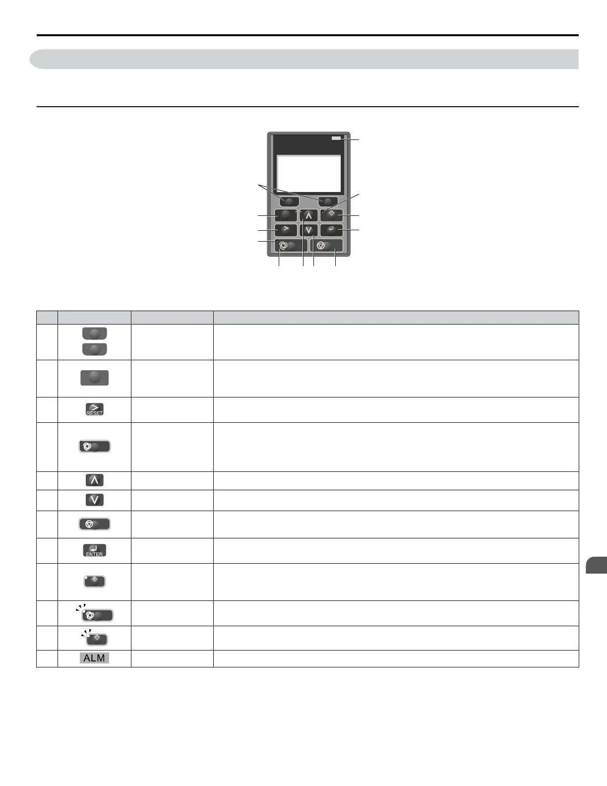 6 Down Arrow Key Scrolls down to display the previous item, selects parameter numbers, and decrements setting values.
