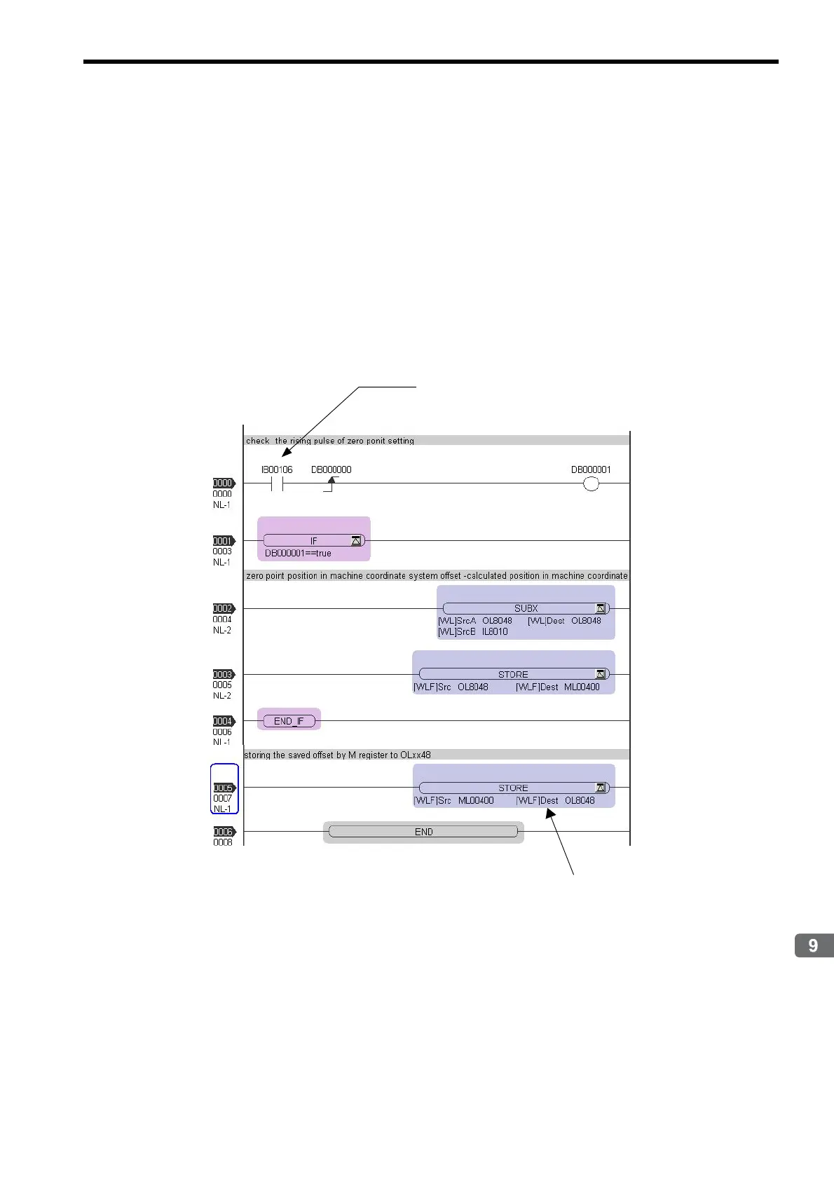 The following diagram shows an example of a ladder program used to store the offset value of axis 1 of line number 1.