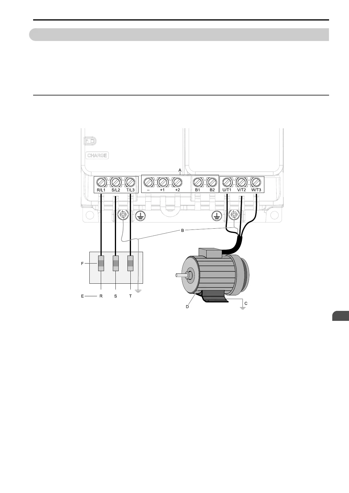 E - Use terminals R/L1, S/L2, and T/L3 for three-