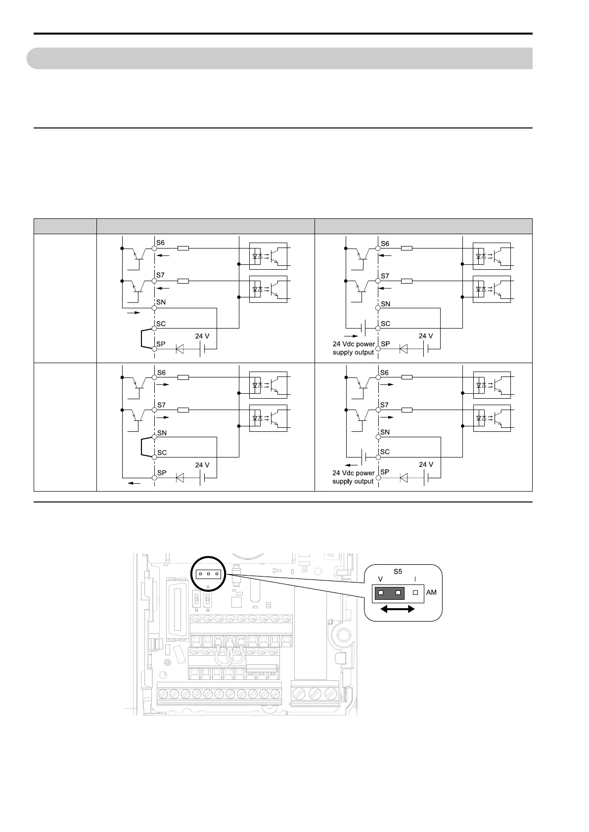 Close the circuit between terminals SC-SP and SC-SN to set the sinking mode/sourcing mode and the internal/