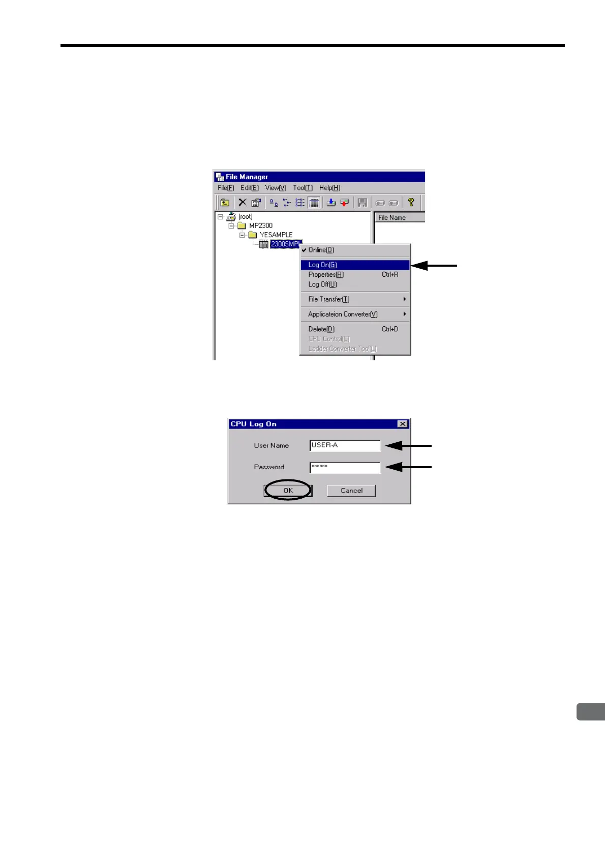 The user name and password are changed from the File menu in the File Manager Window. Refer to Machine