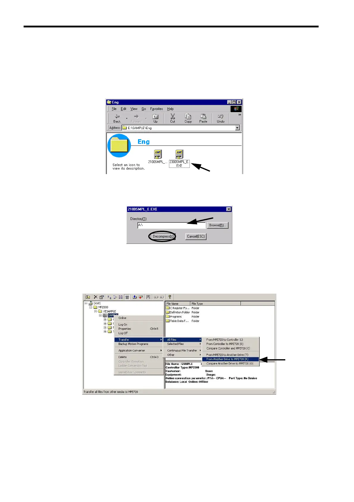 The sample programs on the MPE720 system CD-ROM will be decompressed on the personal computer and loaded to