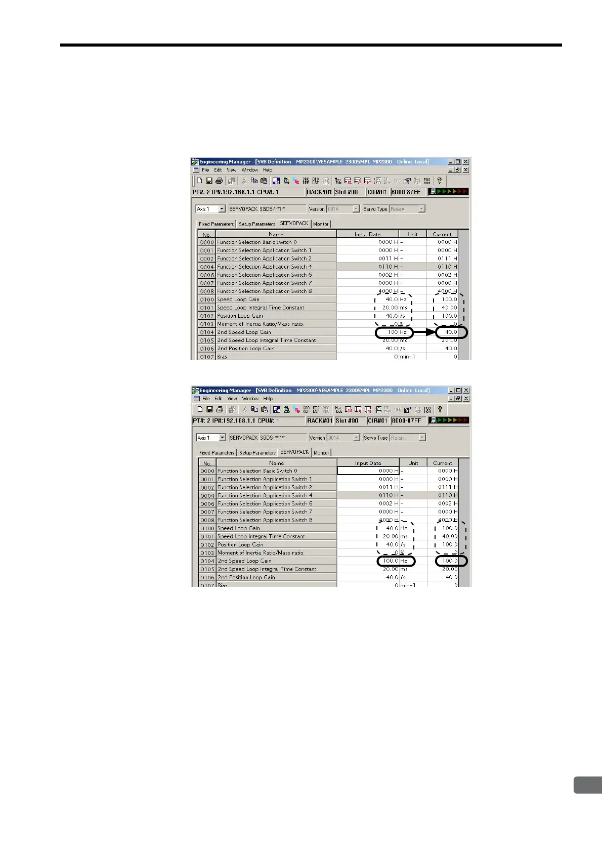 the SERVOPACK Tab Page. After having pressed the ENTER Key, the values of Speed Loop Gain, Speed Loop Inte-